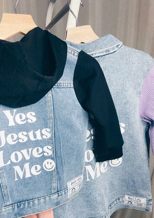 "Jesus Loves Me" Denim Hooded Shacket